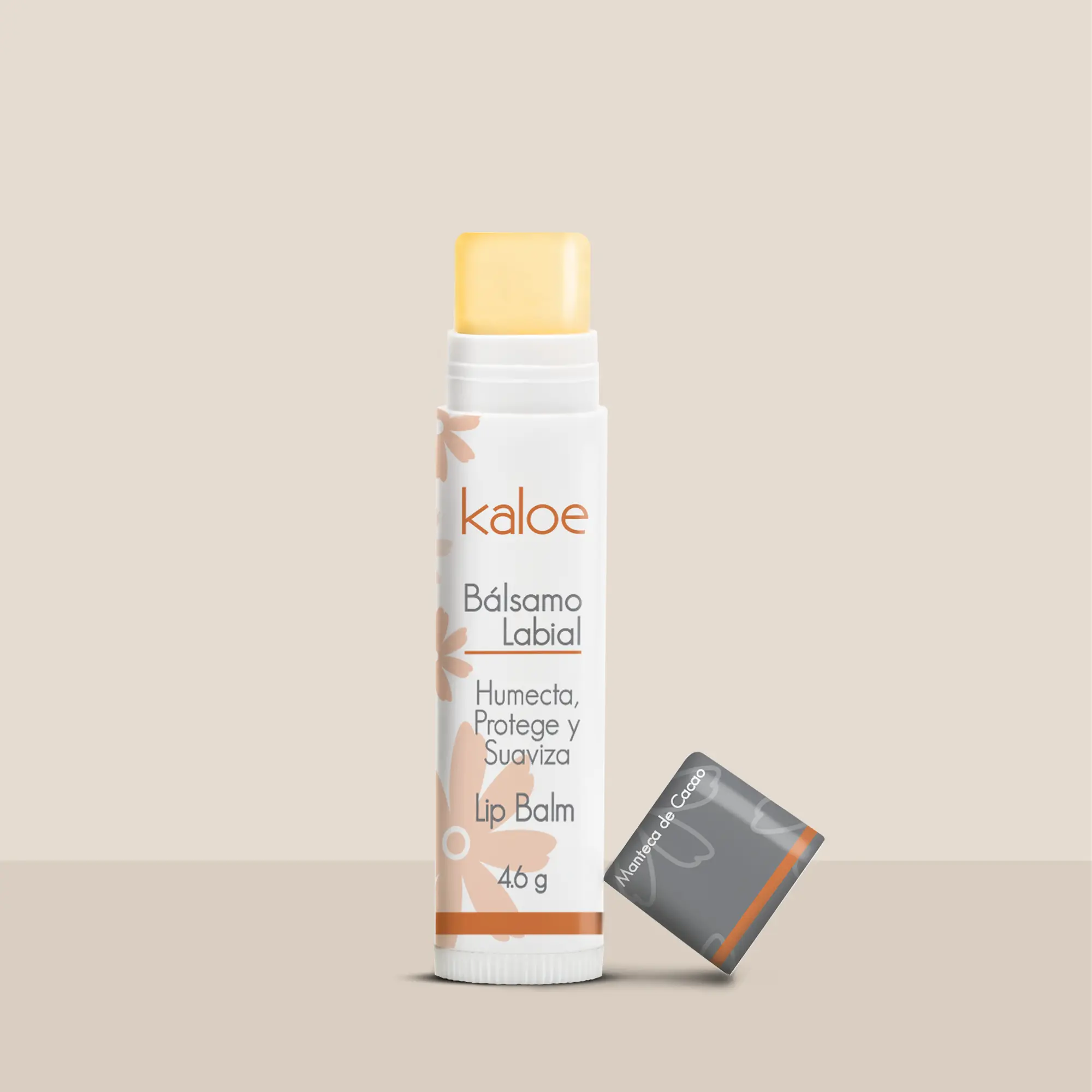 Bálsamo Labial Kaloe, su fórmula a base de Manteca de Cacao, Vitamina E, Caléndula y Aloe Vera proporciona a los labios emoliencia, protege de la resequedad y humecta; dejándolos suaves y renovados.